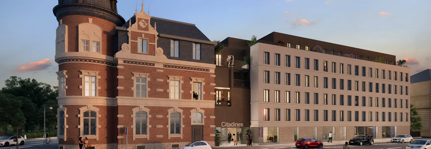 Le programme conjugue réhabilitation patrimoniale de style néo Renaissance et extension contemporaine aux lignes épurées. Les appartements, du studio au 2 pièces, proposent des surfaces moyennes d’environ 26,5 m² pour les T1 et 38 m² pour les T2, avec cuisine équipée et mobilier professionnel de standing, en cohérence avec un classement 4 étoiles supérieur. La résidence intègre des espaces de services qualitatifs : réception, salle de petit déjeuner, salle de réunion, espace fitness et buanderie, complétés par des stationnements en sous sol et extérieurs.