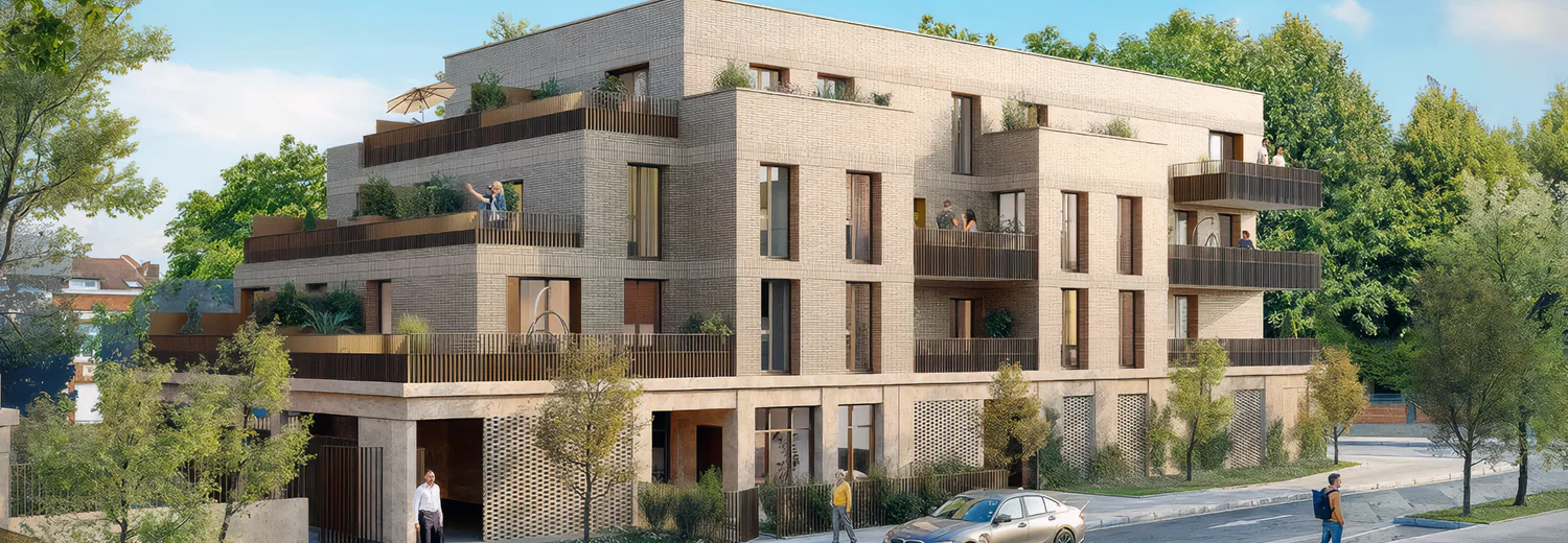 L’architecture contemporaine, sobre et élégante, s’élève sur trois niveaux avec des attiques en gradins. Les façades associent brique, béton lasuré et menuiseries bois, en cohérence avec l’identité locale. Les logements, lumineux et bien agencés, disposent tous d’un espace extérieur privatif (balcon, terrasse ou jardin). Les prestations intègrent des espaces communs qualitatifs avec halls traversants, locaux vélos sécurisés et aménagements favorisant confort et intimité.