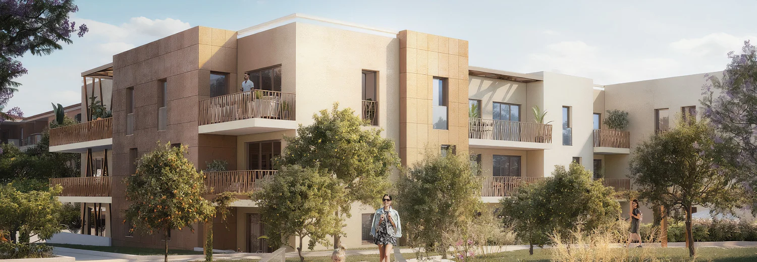L’architecture contemporaine du projet se distingue par des façades élégantes habillées de pierre et des menuiseries en aluminium. Chaque logement a été conçu pour maximiser la luminosité et s’ouvre sur un balcon ou une terrasse privative. Les résidents profitent de prestations de qualité, incluant des parkings sécurisés et un local à vélos. Les parties communes, décorées par un architecte, s’intègrent harmonieusement dans un îlot de verdure méditerranéen occupant la moitié de la surface du terrain.
