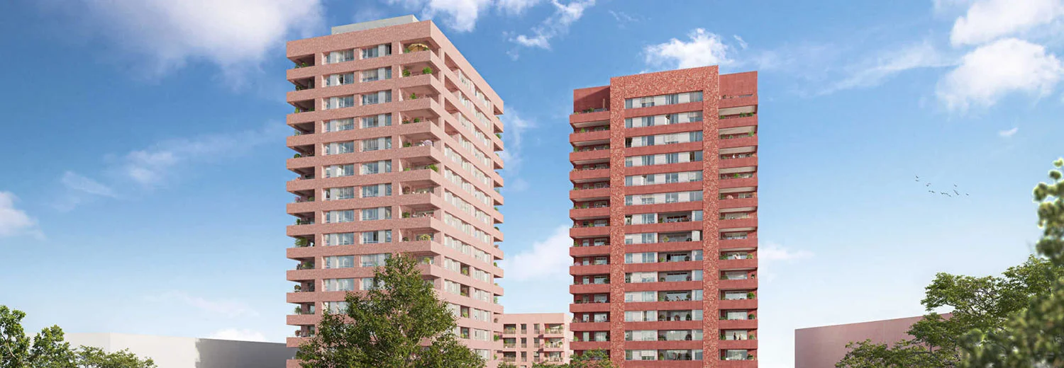 L’architecture élancée s’intègre dans son environnement grâce à des façades aux teintes inspirées du grès local et une composition sobre. La majorité des logements sont traversants, largement ouverts sur le cœur d’îlot paysager ou la future promenade du Rhin. Les appartements bénéficient, pour la plupart, d’une loggia ou d’une terrasse, ainsi que de prestations confortables : ascenseurs, stationnement en parking silo, locaux vélos équipés, sécurité et matériaux à impact environnemental maîtrisé.