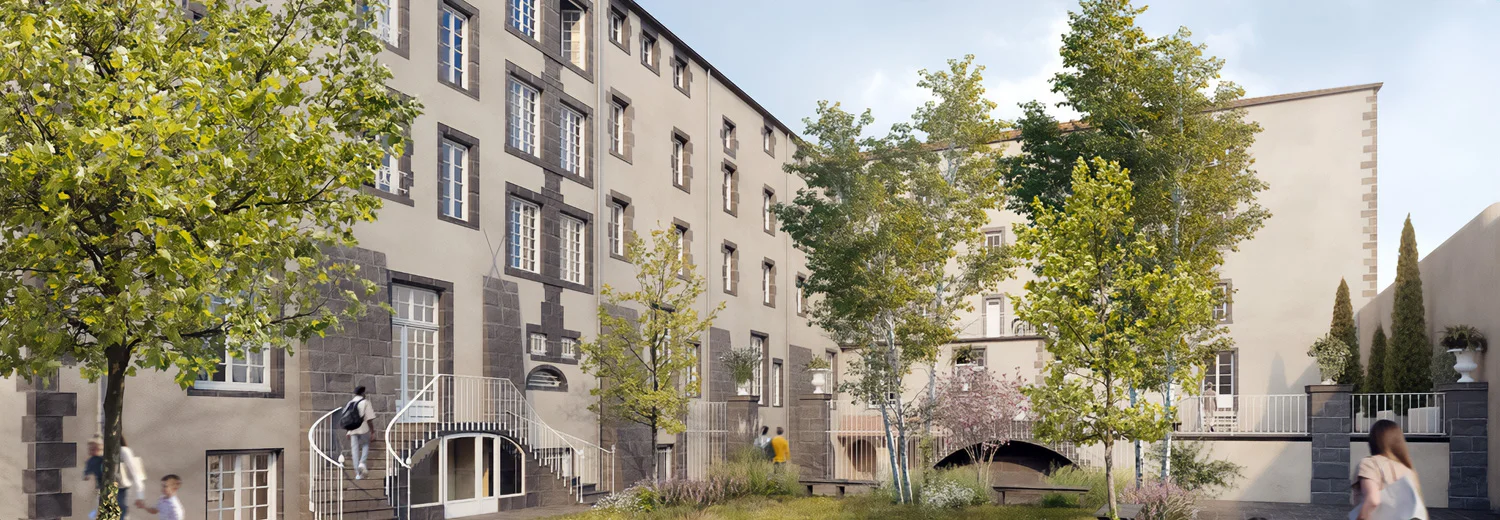 L’opération repose sur une restauration patrimoniale complète, menée dans le strict respect de l’architecture d’origine. Les façades en pierre de Volvic, les cloîtres, escaliers classés, parquets anciens, moulures, cheminées et plafonds décorés font l’objet d’un travail minutieux de conservation et de remise en valeur. Les logements sont entièrement réhabilités avec des équipements contemporains, tout en préservant les éléments historiques remarquables. Les parties communes sont repensées par un architecte d’intérieur et les cours intérieures sont re-végétalisées afin de renforcer le confort et la qualité d’usage.
